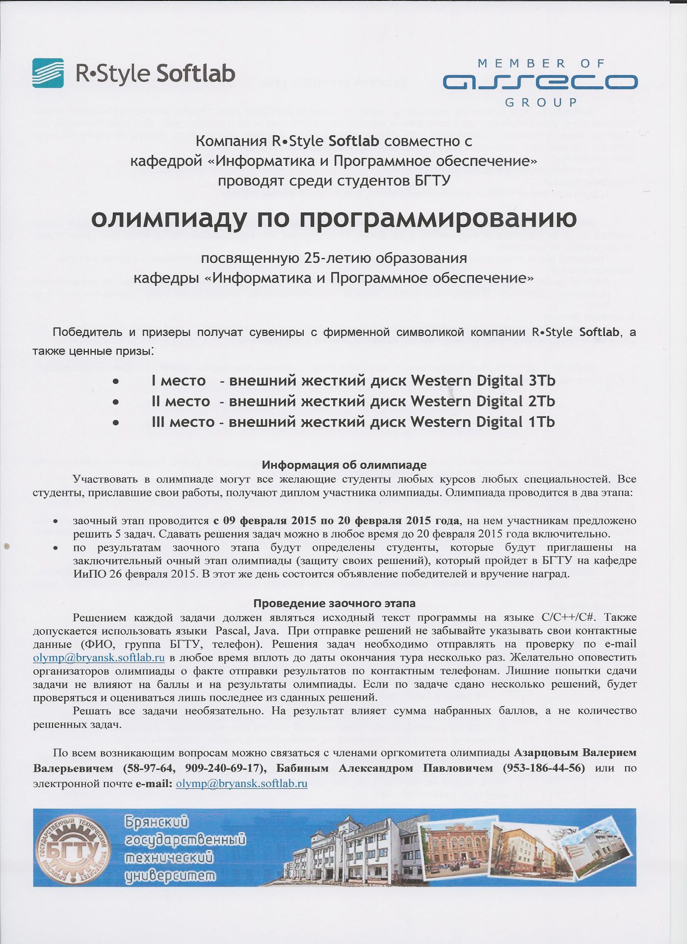 Компания R-Style Softlab совместно с кафедрой "Информатика и программное обеспечение" проводят среди студентов БГТУ олимпиаду по программированию, посвященную 25-летию образования кафедры "Информатика и программное обеспечение".